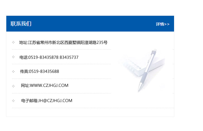 地址:常州市新北區友邦商務大廈1幢16、17層  電話:0519-85101652  傳真:0519-85112595  郵編:213022  網址:www.cz-jiayue_cn.rsnydp.com  郵箱:xiajifengaa@163.com